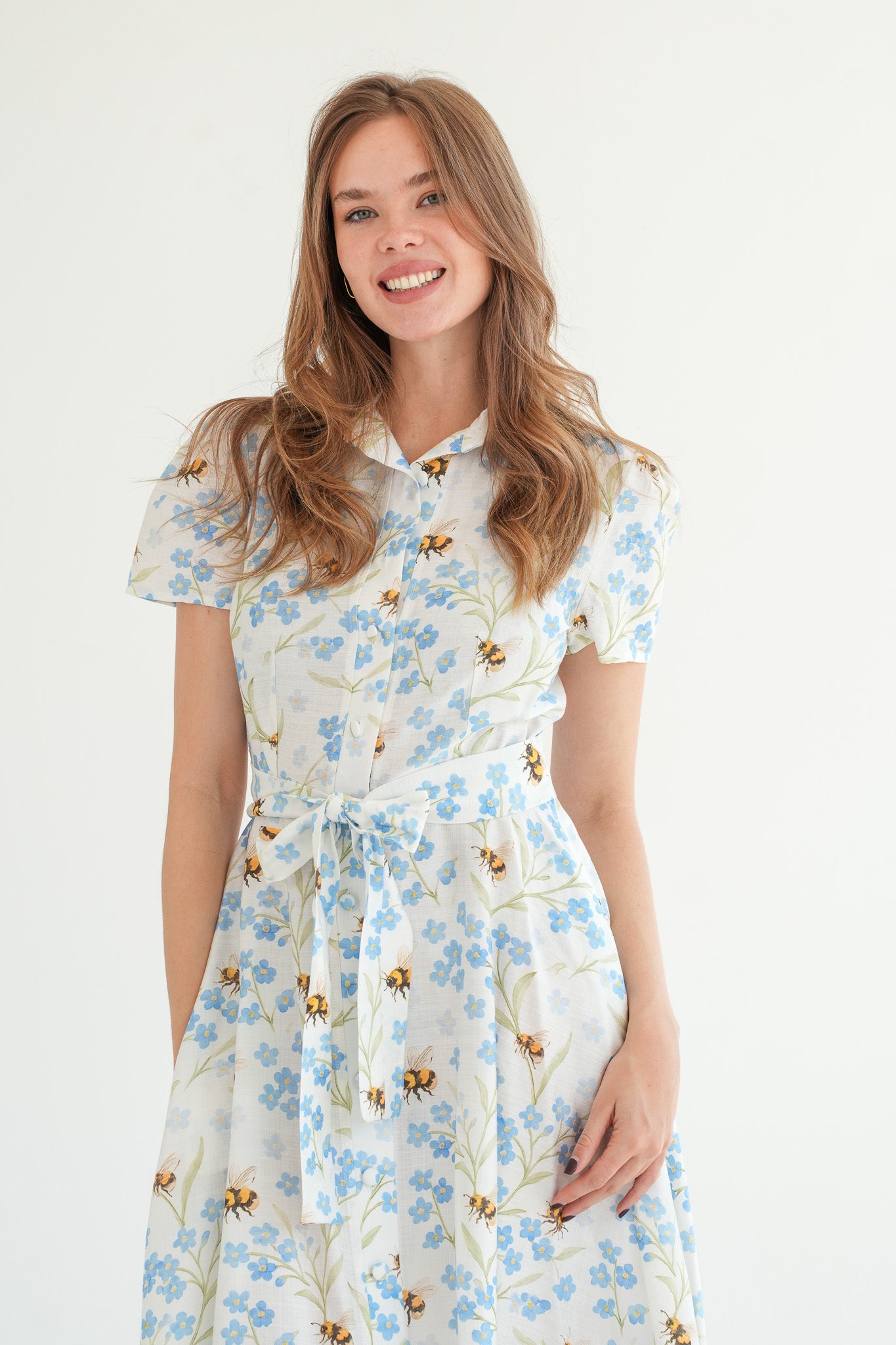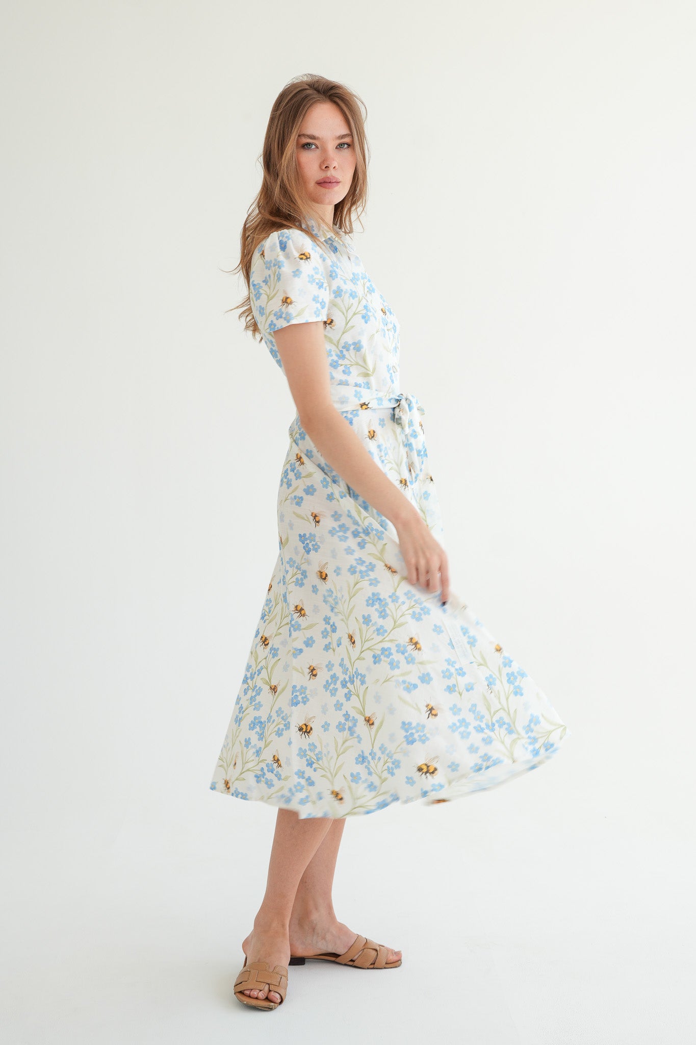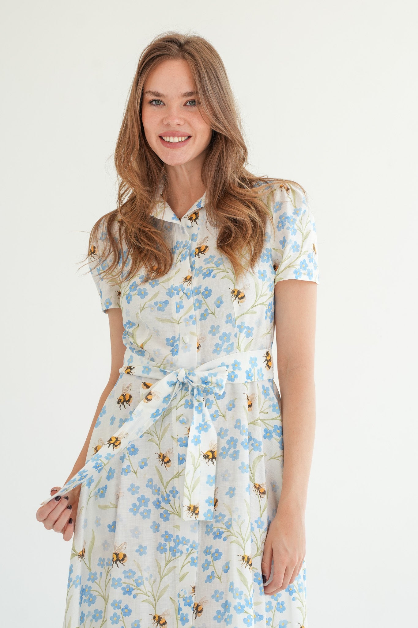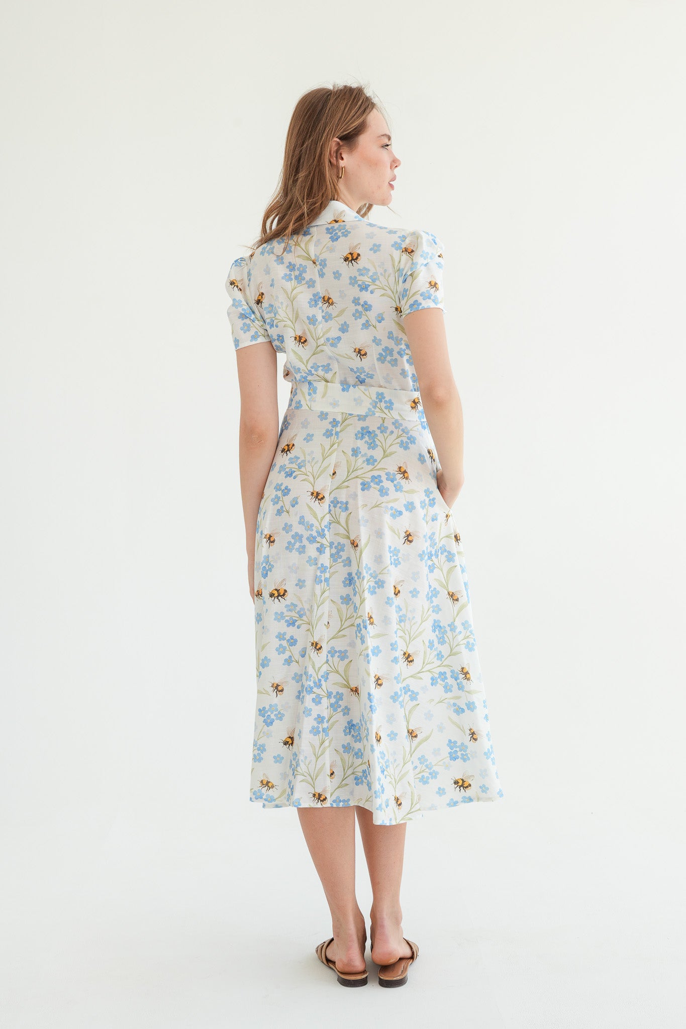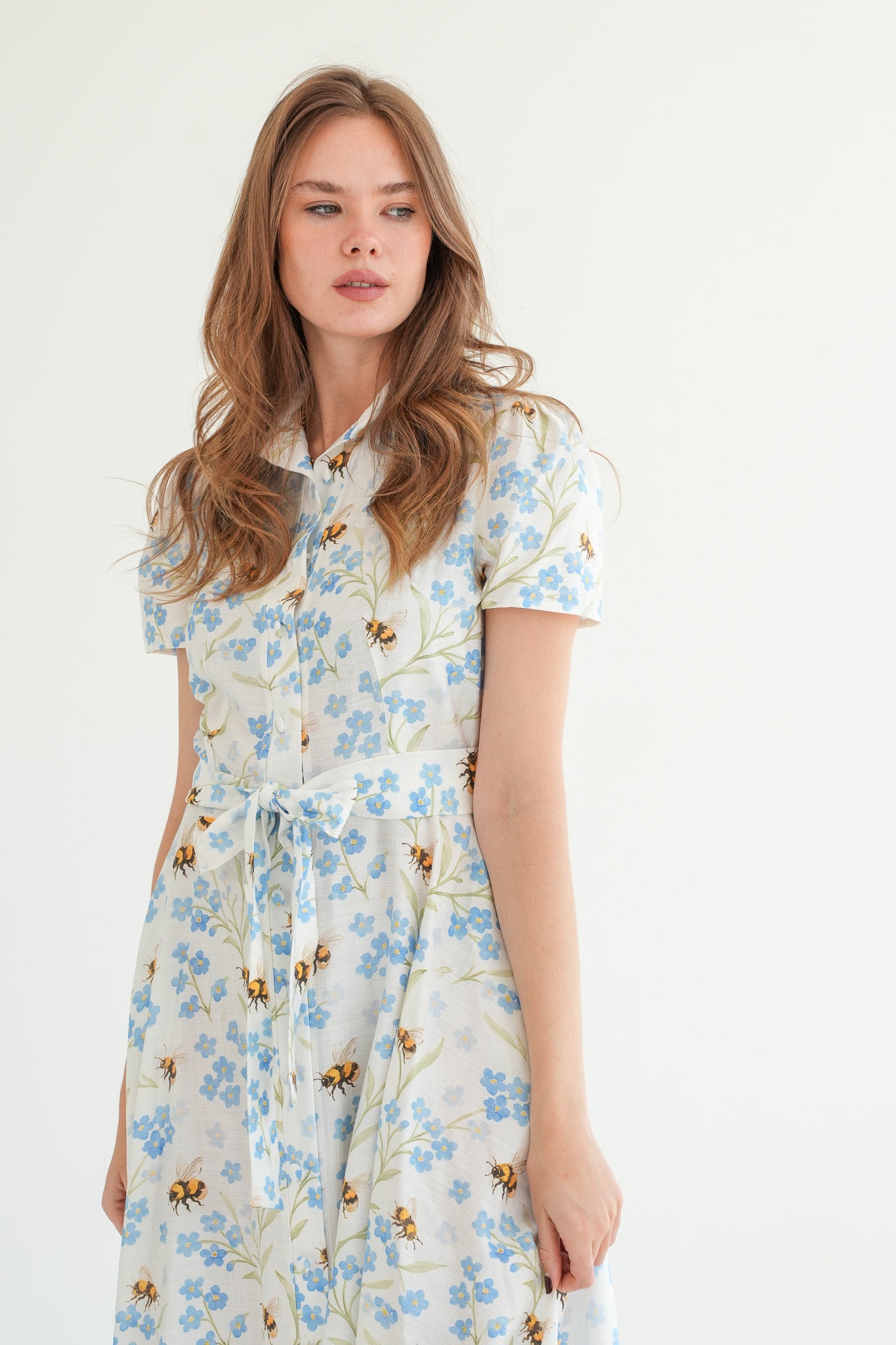 The Signature Dress is a structured, ankle-length dress designed with short capped sleeves, a full collar, and covered front buttons. The silhouette is softly shaped through the waist, with a fabric belt sewn into the side seams to define the waist without adding bulk or needing adjustment.