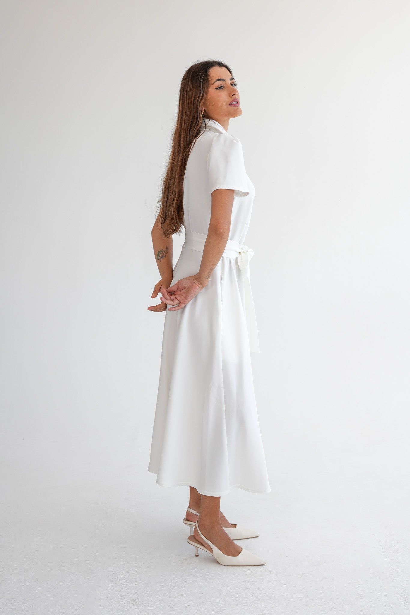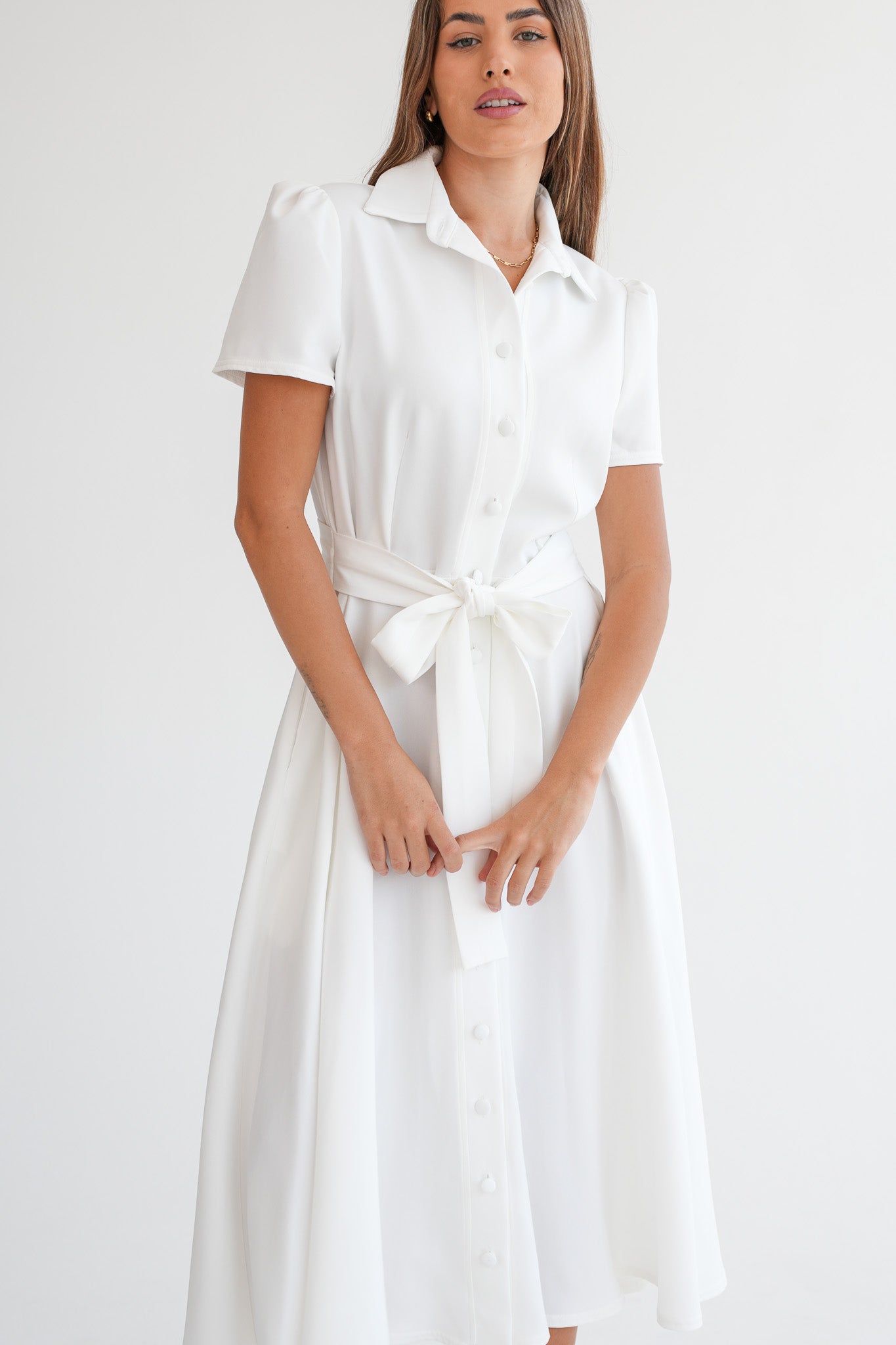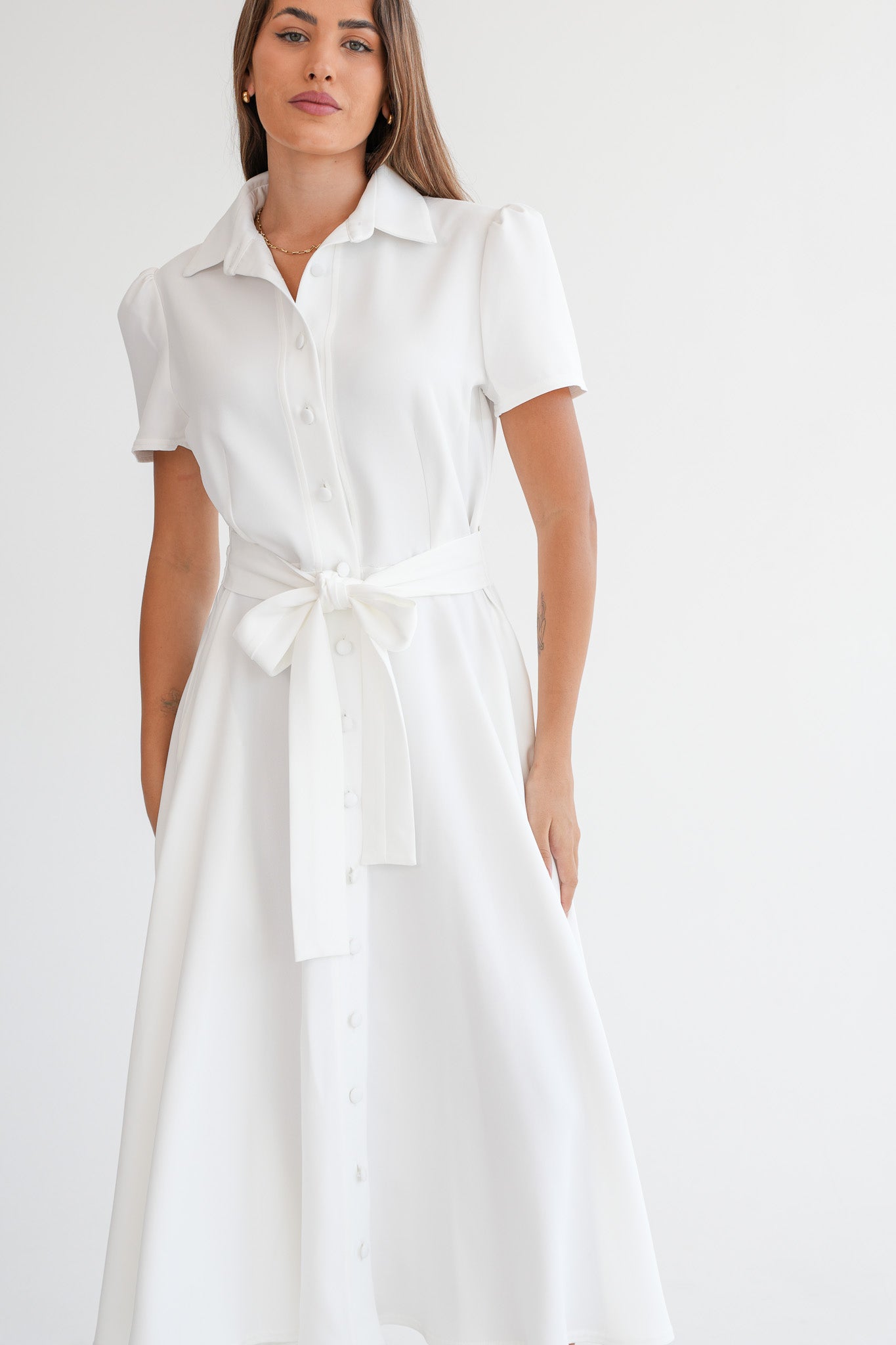 The Signature Dress is a structured, ankle-length dress designed with short capped sleeves, a full collar, and covered front buttons. The silhouette is softly shaped through the waist, with a fabric belt sewn into the side seams to define the waist without adding bulk or needing adjustment.