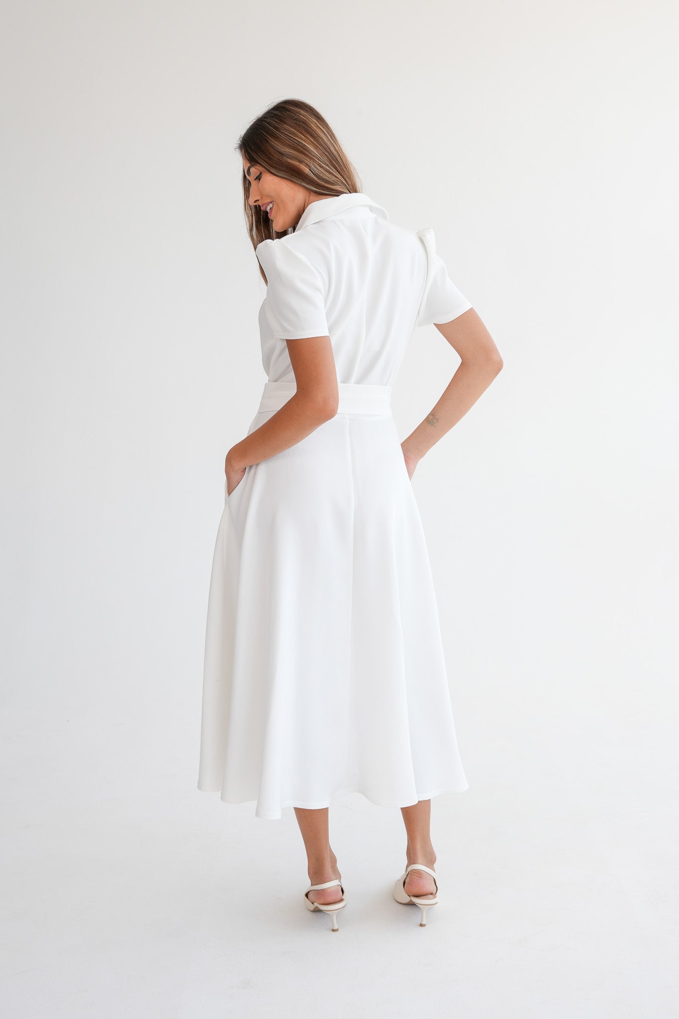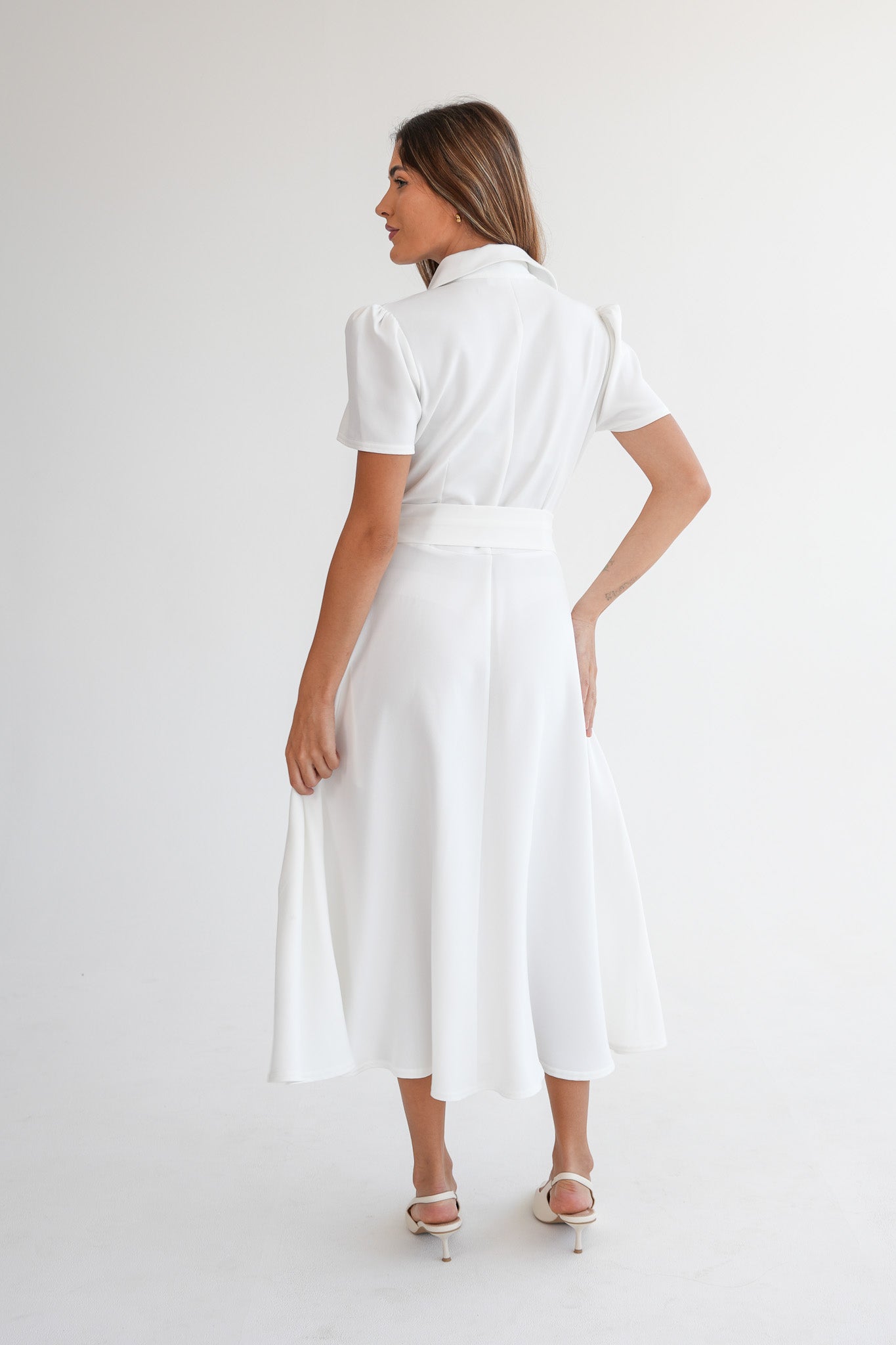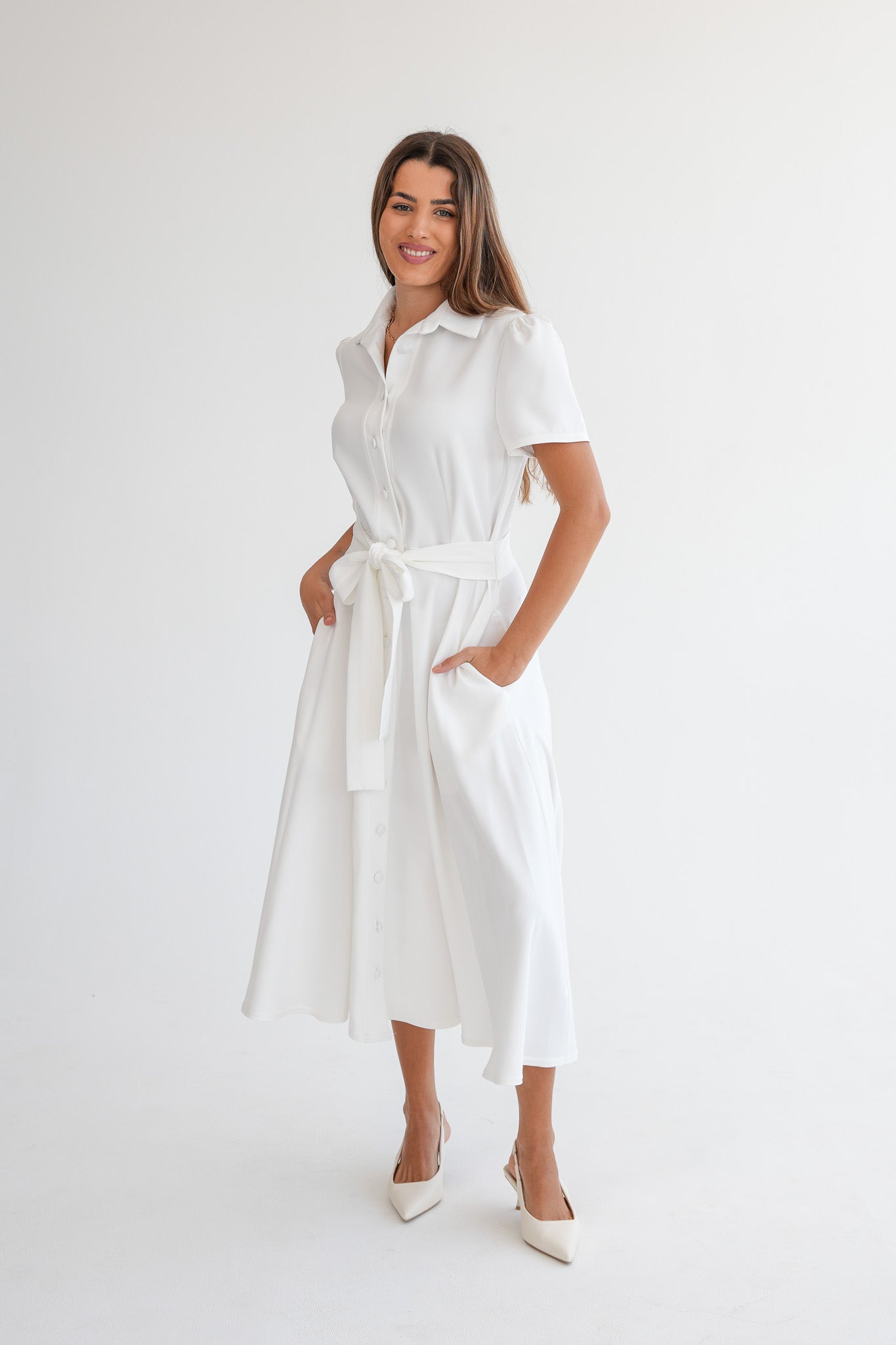 The Signature Dress is a structured, ankle-length dress designed with short capped sleeves, a full collar, and covered front buttons. The silhouette is softly shaped through the waist, with a fabric belt sewn into the side seams to define the waist without adding bulk or needing adjustment.
