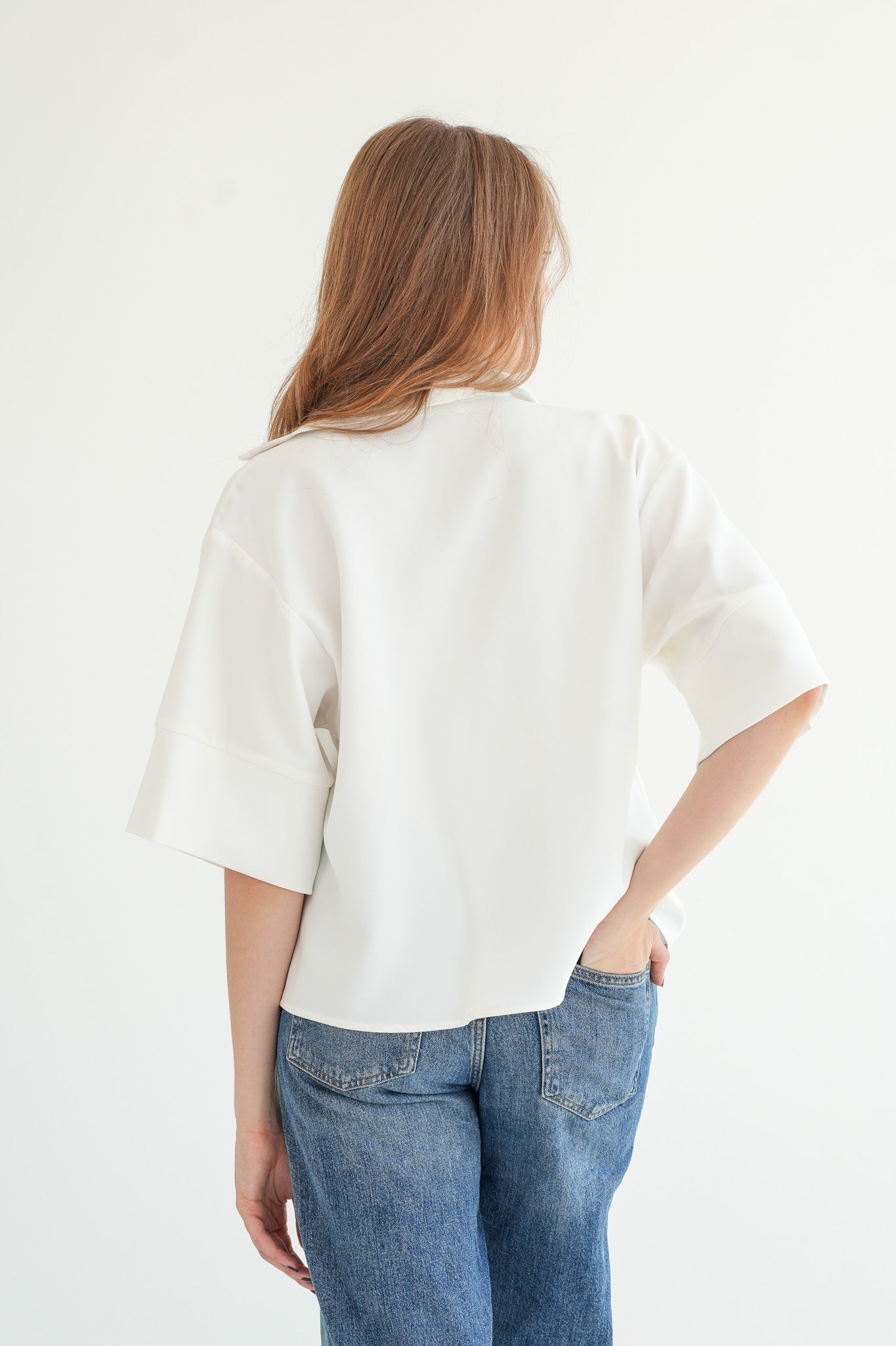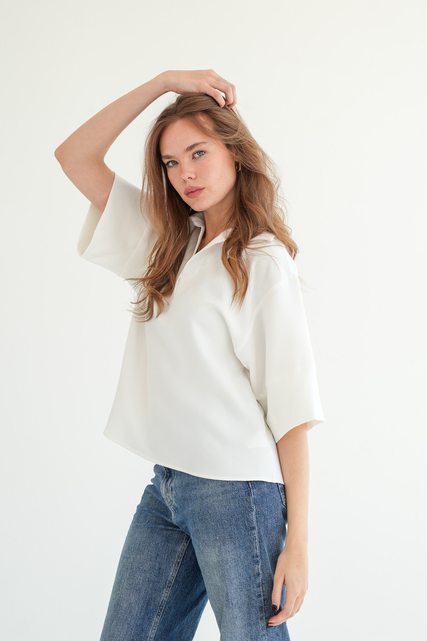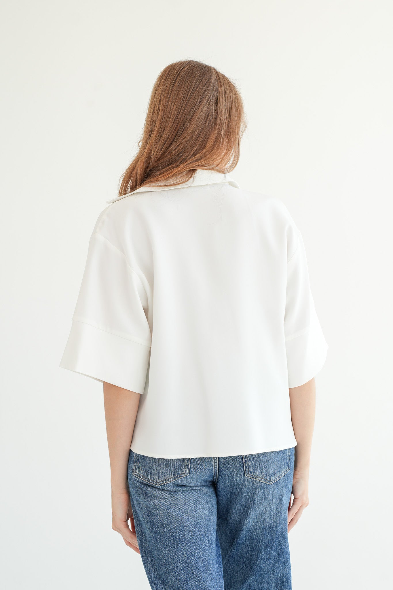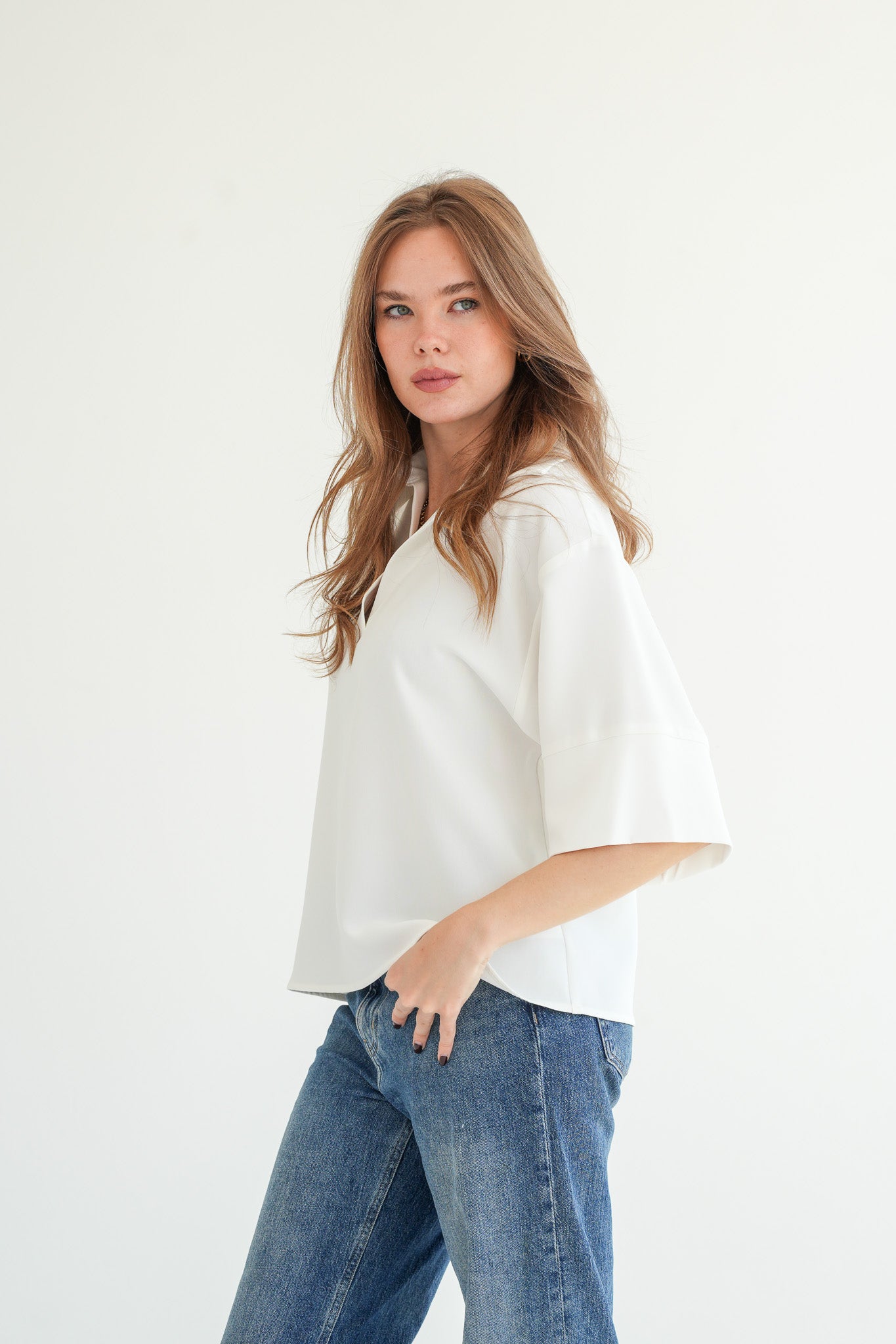 The Amelia Blouse is a relaxed, loose-fitting blouse designed with a soft open neckline and a clean, minimal finish. The subtle V-split at the front creates a refined focal point while maintaining an effortless, everyday feel. With gently structured shoulders and wide short sleeves, the blouse falls naturally through the body for an easy, fluid silhouette.