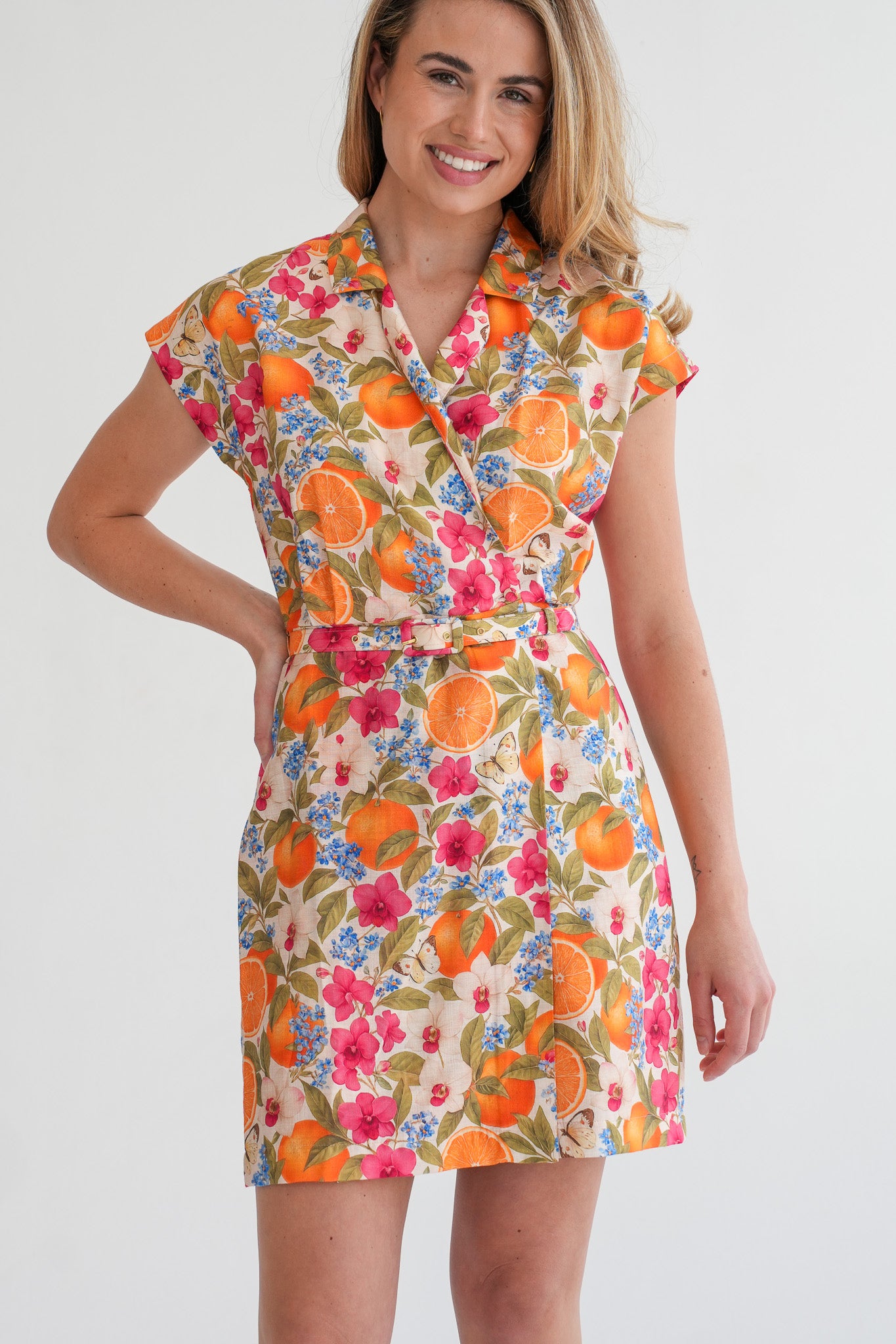 The Cara Belted Dress features a tailored wrap silhouette with a soft collar and capped sleeves. The matching belt shapes the waist, and the above-the-knee length gives it a modern, easy look.