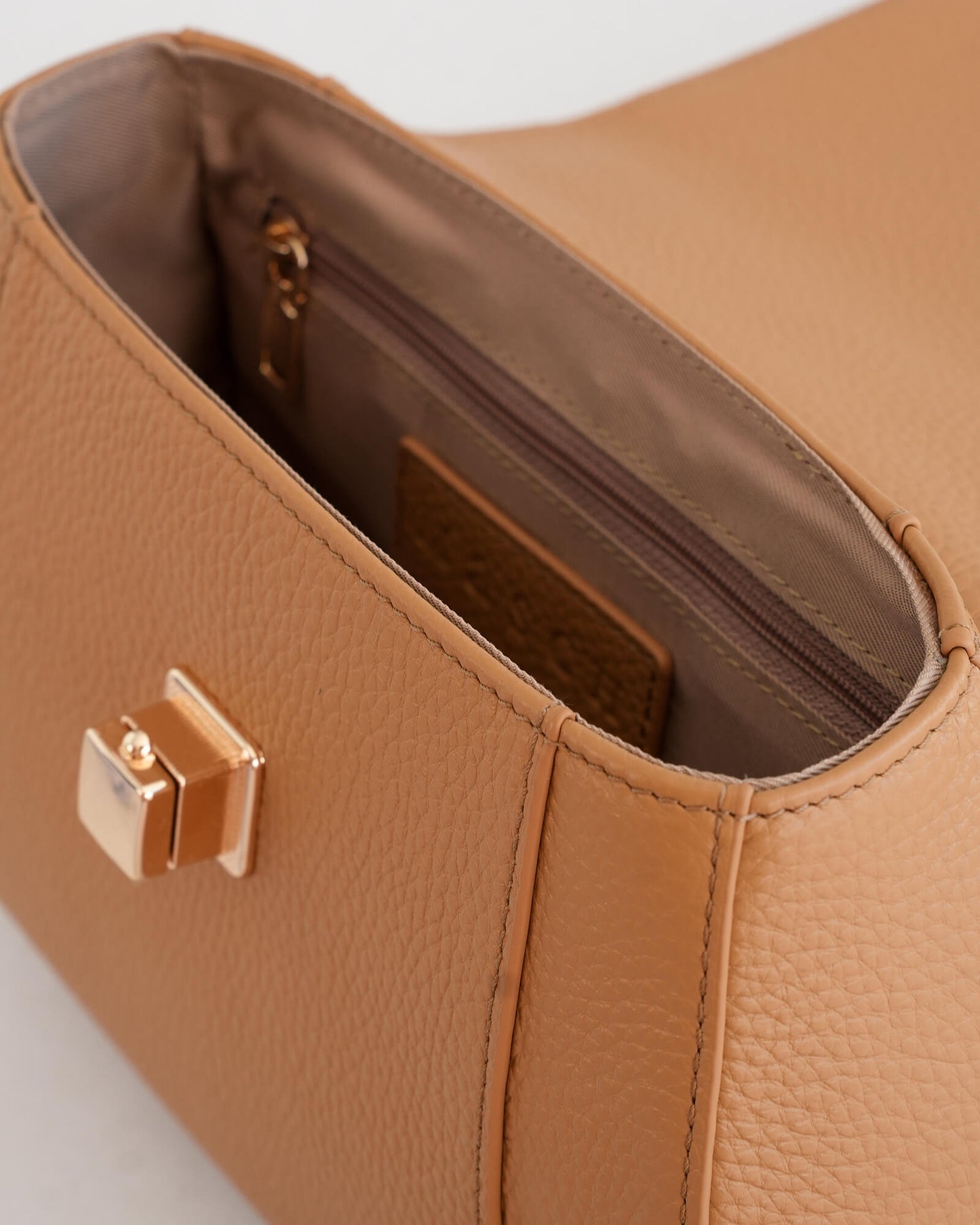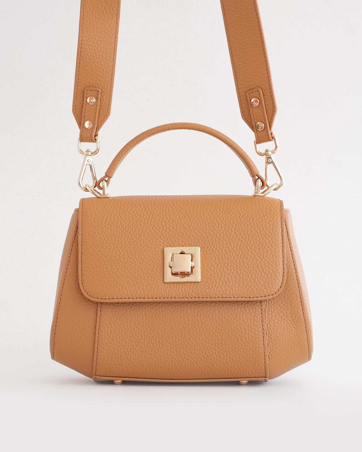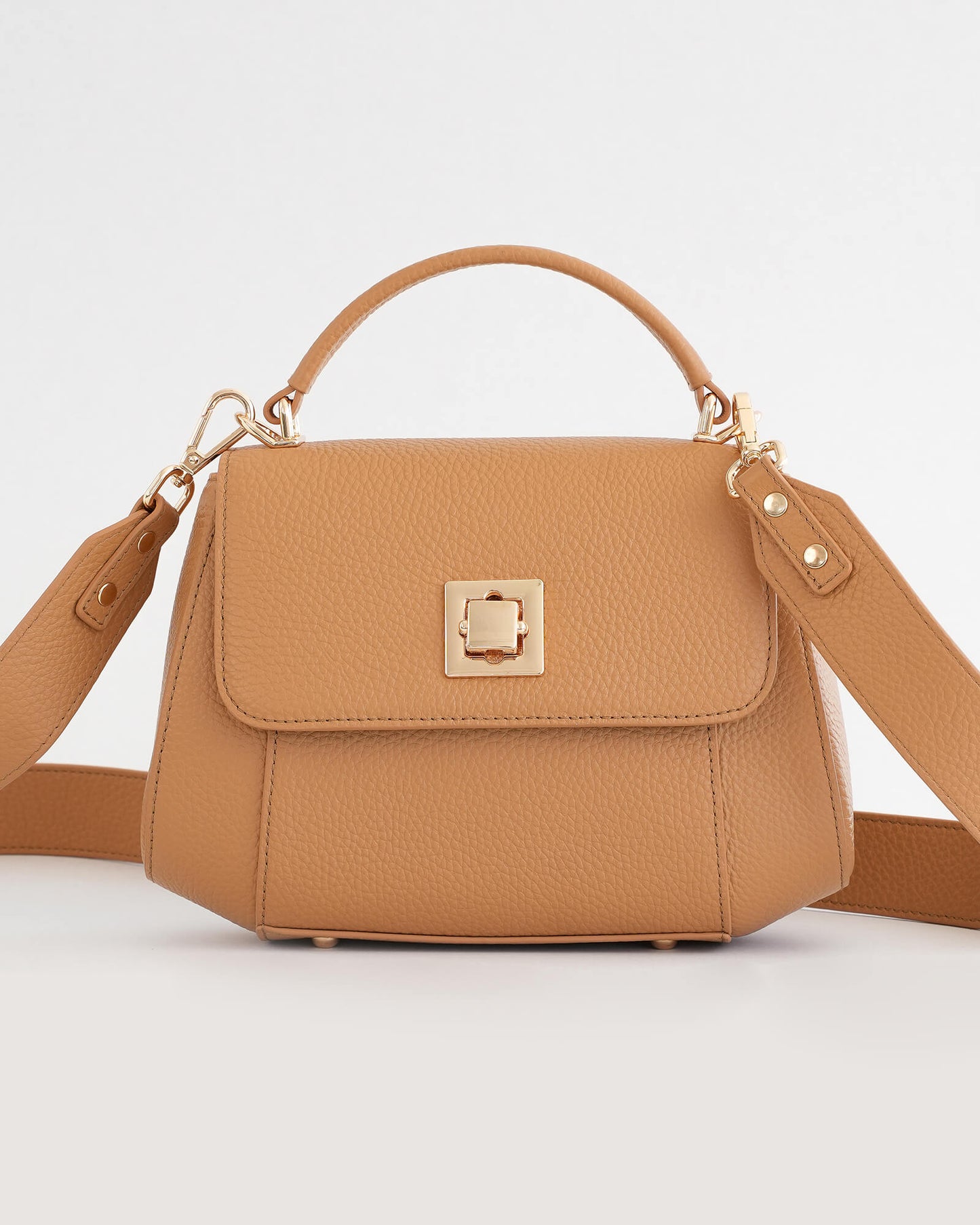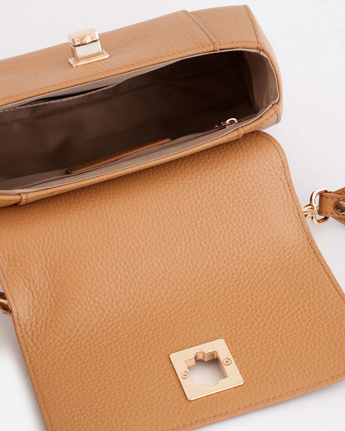 At the centre, a sculptural square clasp becomes the focal point of the design. Crafted in premium full grain pebble leather, the Mira offers depth in texture while maintaining its structured shape by allowing the bag to hold its form while remaining soft in hand.