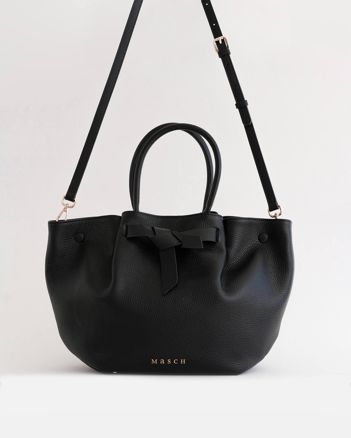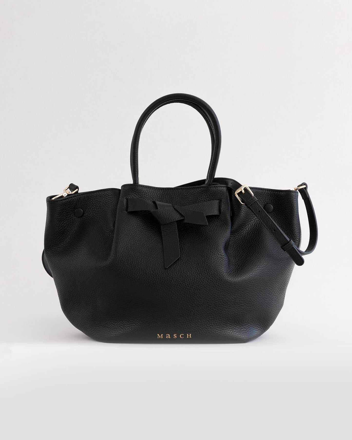 At the centre front, the signature Masch bow — reinterpreted from a previous silhouette — adds continuity to our design language. It is not decorative, but functional by folding open to lengthen the bag if more space is needed.