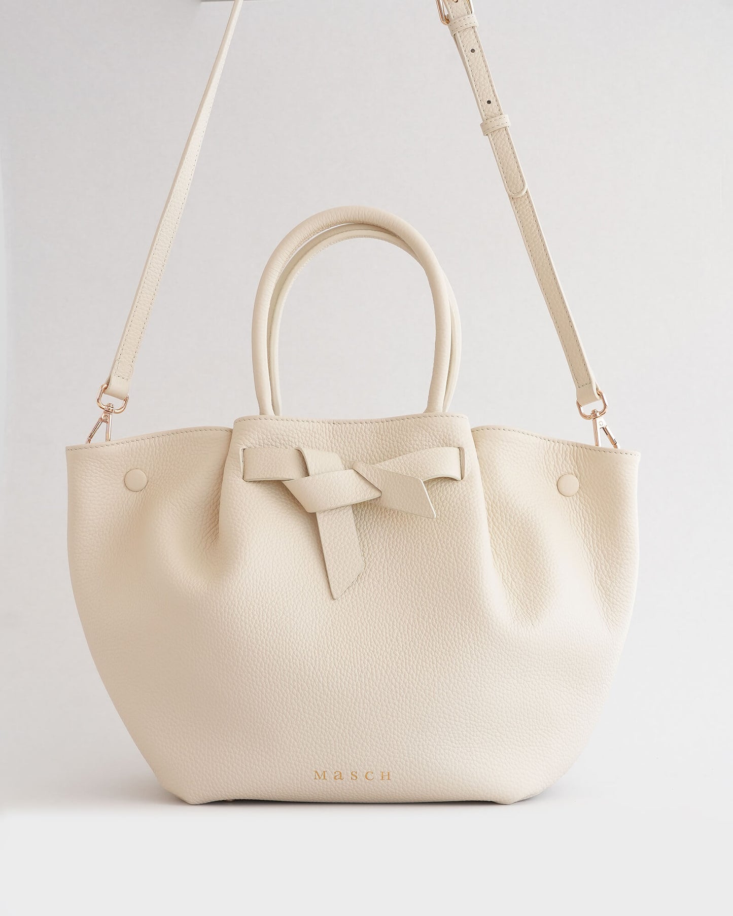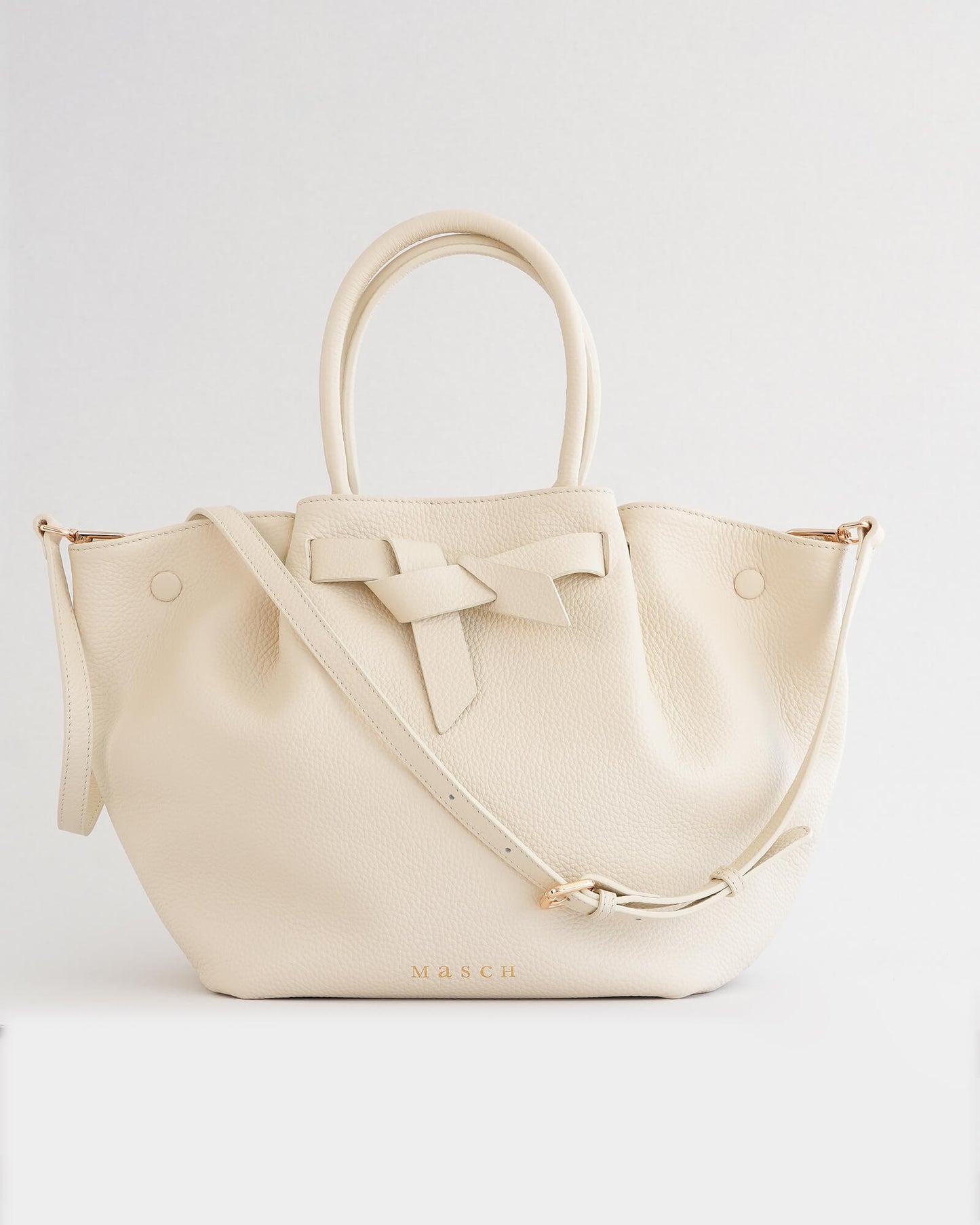 At the centre front, the signature Masch bow — reinterpreted from a previous silhouette — adds continuity to our design language. It is not decorative, but functional by folding open to lengthen the bag if more space is needed.